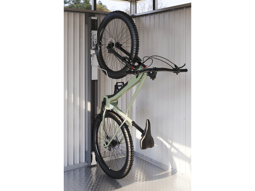 Statický pružinový výtah s držákem na uskladnění jízdního kola do zahradního domku Biohort Neo je jednoduchý na obsluhu.