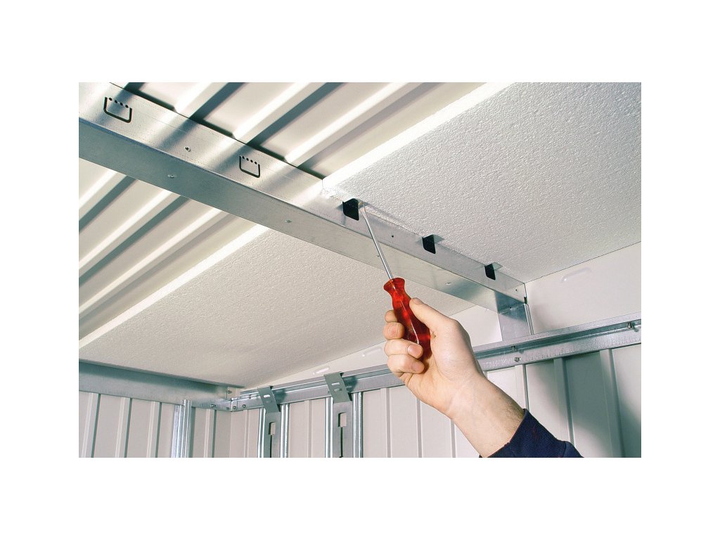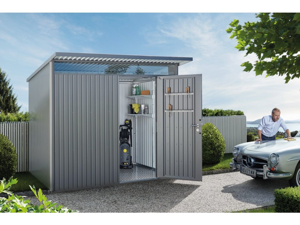Zahradní domek Biohort AvantGarde s jednokřídlými dveřmi má po celém svém obvodu profilované ocelové plechy ošetřené žárovým zinkem a polyamidovým vypalovaným lakem. Profily v obvodovém plášti dávají domku větší stabilitu (vítr do 150 km/h- síla 12), zvyšují jeho pevnost (zatížení sněhem až 150 kg/m2) a také eliminují hlučnost plechů při větším větru. Šikmá plochá střecha dobře odvádí vodu do integrovaného okapu v zadní části domku, který je opatřen dvěma plastovými nástavci pro napojení hadic nebo okapových svodů (příplatek). Nad dveřmi je umístěný světlík z akrylátového skla, který v kombinaci s šedo-bílými stěnami zlepšuje viditelnost uvnitř domku. Otevírání a zavírání dveří funguje poloautomaticky pomocí plynové pružiny. Dveře mají třícestný uzamykací mechanismus s robustním cylindrickým zámkem. Kotvení domku se provádí do daného podloží přes zpevňovací límec na spodní části stěn nebo s pomocí hliníkového podlahového rámu, který domek více vyztuží. Podlahový rám není součástí základního vybavení domku (doporučujeme dokoupit pokud nemáte rovný betonový podklad).