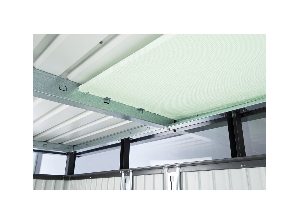 Zahradní domek Biohort HighLine s dvoukřídlými dveřmi má po celém svém obvodu profilované ocelové plechy ošetřené žárovým zinkem a polyamidovým vypalovaným lakem. Profily v obvodovém plášti dávají domku větší stabilitu (vítr do 150 km/h- síla 12), zvyšují jeho pevnost (zatížení sněhem až 150 kg/m2) a také eliminují hlučnost plechů při větším větru. Nenápadná plochá střecha domku je uprostřed přizvednuta hliníkovým traverzem, aby voda při dešti lépe odtékala do integrovaných okapů, které jsou opatřeny plastovým nástavcem pro napojení hadic nebo okapových svodů (příplatek). Vyvýšení tohoto traverzu není pohledově patrné, neboť je zapuštěno pod okrajovým límcem střechy. Pod střešním límcem jsou po jeho celém obvodu umístěné světlíky z akrylátového skla, které místnost dobře prosvětlí. Lepší viditelnost zvyšují i vnitřní šedo-bílé stěny. Otevírání a zavírání dvěří funguje poloautomaticky pomocí plynové pružiny. Dveře mají třícestný uzamykací mechanismus s robustním cylindrickým zámkem. Kotvení domku se provádí do daného podloží přes zpevňovací límec na spodní části stěn nebo s pomocí hliníkového podlahového rámu, který domek více zpevní. Podlahový rám není součástí základního vybavení domku (doporučujeme dokoupit pokud nemáte rovný betonový podklad). Domek můžete rozšířit o krátkou nebo dlouhou postranní střechu. Využití této postranní střechy je pouze na Vaší fantazii (sezení, skútr, jízdní kola, atd.).
