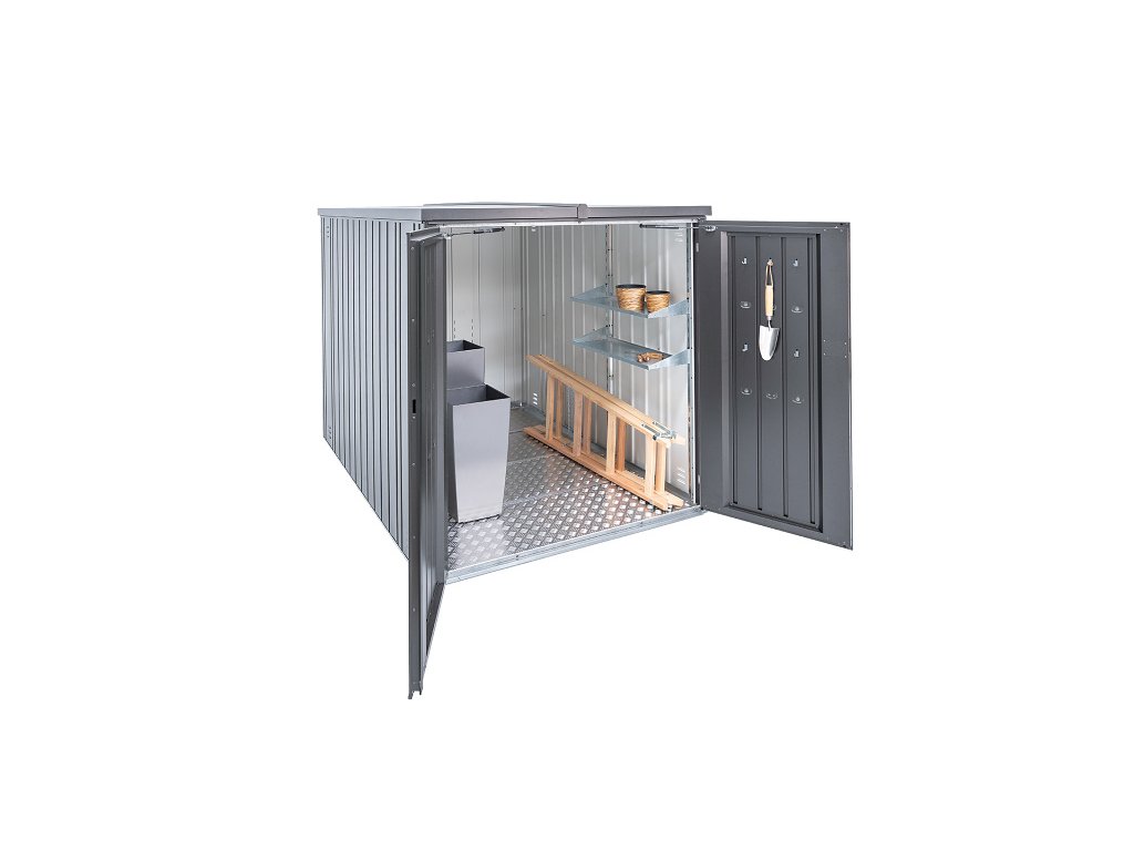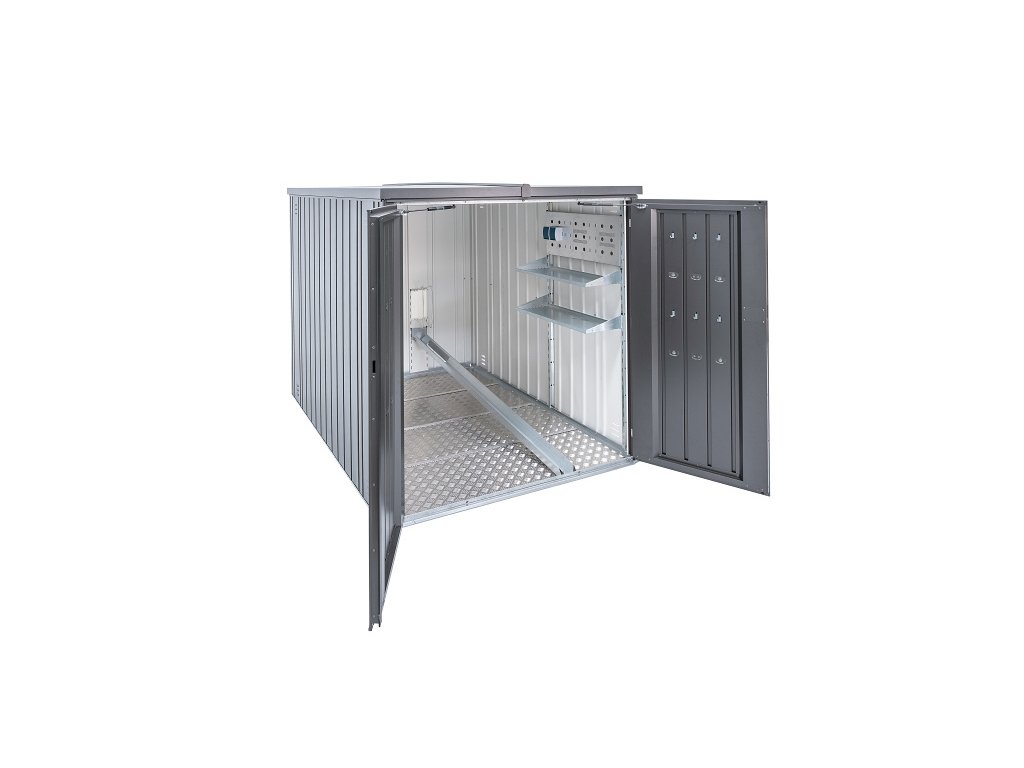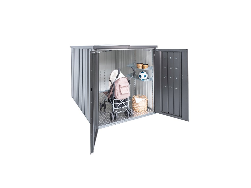 Zahradní úložný box Biohort MiniGarage je určený především pro úschovu jízdních kol. Box nebo-li minigaráž má po celém svém obvodu prolisované ocelové plechy ošetřené žárovým zinkem a polyamidovým vypalovaným lakem. Dveřní křídla minigaráže se otevírají poloautomaticky pomocí plynové pružiny. Dveře jsou zajištěny proti náhodným zlodějům trojcestným uzamykacím mechanismem s integrovaným cylindrickým zámkem v otočné rukojeti. Vnitřní šedo-bílé stěny zvyšují prosvětlení boxu, což oceníte při slabším světle. Integrovaný odvětrávací systém zajišťuje dobrou cirkulaci vzduchu v jakémkoliv ročním období a minimalizuje možnost poškození věcí plísněmi. Kotvení boxu se provádí do daného podloží přes zpevňovací límec umístěný na spodní části stěn nebo s pomocí hliníkového podlahového rámu MiniGarage, který box více vyztuží a umožní instalaci hliníkové podlahové desky MiniGarage. Podlahový rám a podlahová deska nejsou součástí základního vybavení boxu (rám doporučujeme dokoupit pokud nemáte rovný betonový podklad).