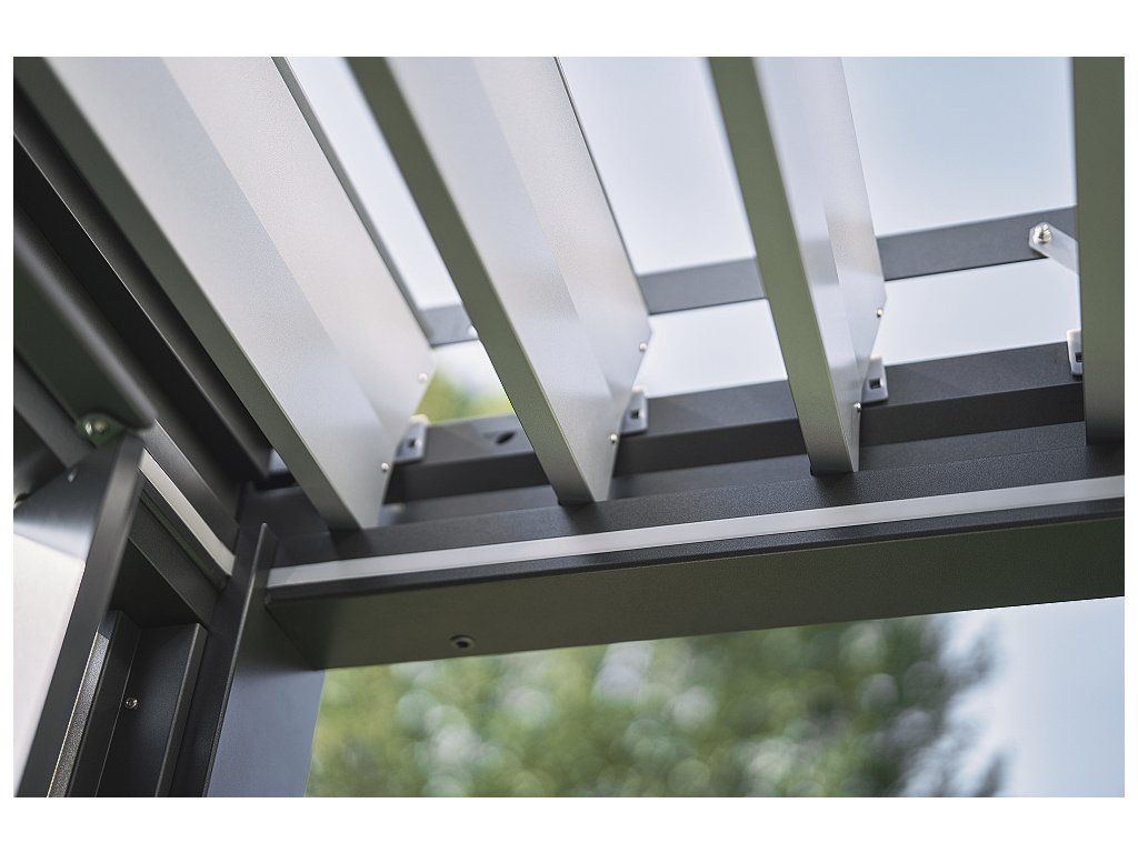 Příplatková doplňková výbava dále nabízí LED osvětlení pro zabudování do střešní hliníkové konstrukce. "Teplé" osvětlení podtrhuje elegantní tvary pergoly a navodí příjemný pocit při nočním sezení. Pro vytvoření úplného soukromí můžete vybírat mezi bočními polohovatelnými lamelami a výškově nastavitelnou manuální nebo elektrickou sluneční clonou. Pro uzavření prostoru pergoly nabízíme posuvnou prosklenou stěnu, která zajistí ničím nerušený výhled do okolí.