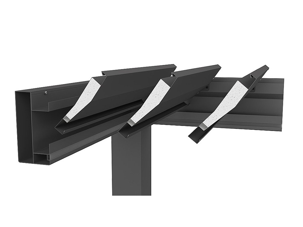 Materiál stojných podpěr a střešních lamel: Žárově pozinkovaný ocelový plech opatřený polyamidovým vypalovaným lakem