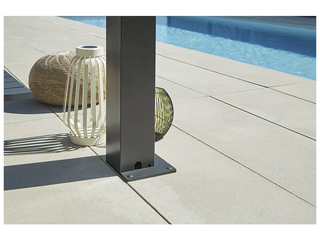 Kotvení samostatně stojící pergoly se provádí skrz připravené otvory na patkách stojných nohou konstrukce (1 noha/3 otvory). Pergolu je nutné kotvit do pevného betonového povrchu. Při umístění pergoly na terasu nabízíme výškově nastavitelné patky pro bezpečné ukotvení.