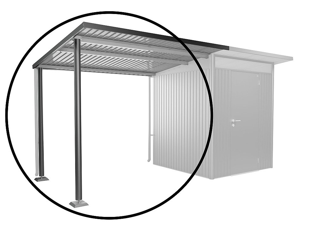 Boční střecha k zahradnímu domku Biohort AvantGarde/AvantGarde ECO vytvoří další krytý úložný prostor. Odvod dešťové vody z boční střechy zajišťují dva okapové svody. U boční střechy je možné prostor částečně uzavřít pořízením zadní nebo boční stěny.