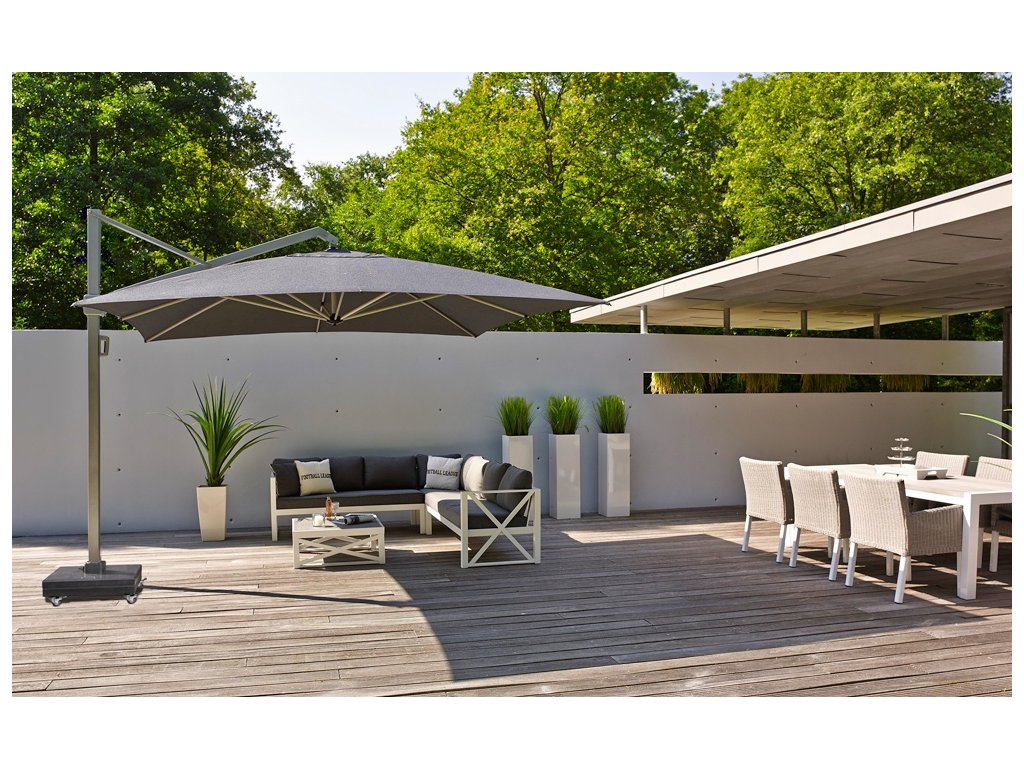 Velký obdélníkový slunečník Icon je opravdovou lahůdkou na našem trhu. Hlavní částí slunečníku je mohutná konstrukce s hranatými tvary a stojná noha s integrovaným litinovým mechanismem pro naklápění vrchlíku. Tuto funkci využijete při západu slunce, kdy se sluneční paprsky pohybují velmi nízko nad obzorem. Díky mechanismu s pedálem je slunečník otočný okolo své osy o 360°. Vrchlík s průvlakem redukuje proplouvání větru. Potah vrchlíku je z prémiového materiálu s dlouholetou trvanlivostí.