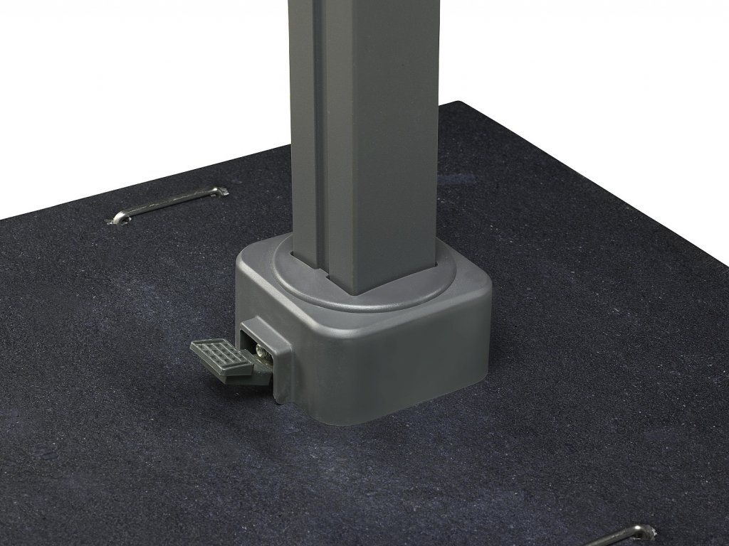 Ve spodní části slunečníku je otočný mechanismus opatřený 4-mi otvory pro ukotvení stojné nohy přímo do pevného podkladu (beton). Pro uchycení slunečníku v nezpevněném terénu máme v nabídce zabetonovávací modul. Pokud plánujete slunečníkem pohybovat po zpevněném podloží (beton, dlažba, terasová prkna), můžete zakoupit žulový pojízdný podstavec Modena 150 kg. U podstavce Modena 150 kg se dají v případě potřeby kolečka nahradit "nožičkami" a vznikne tak statický podstavec.