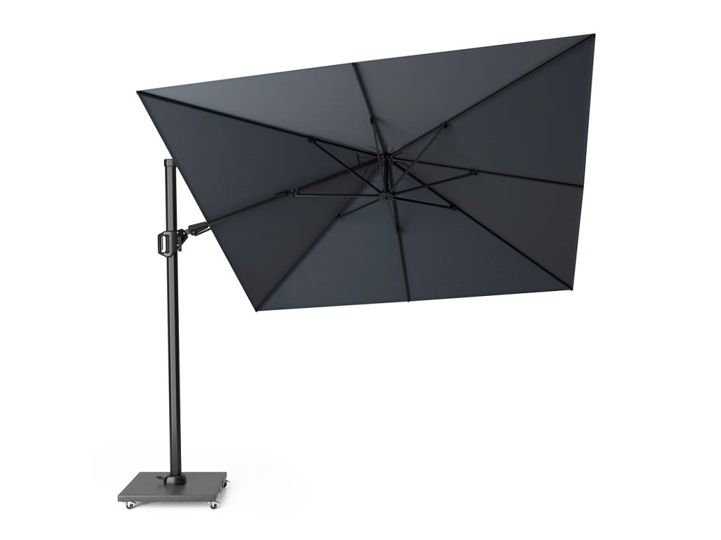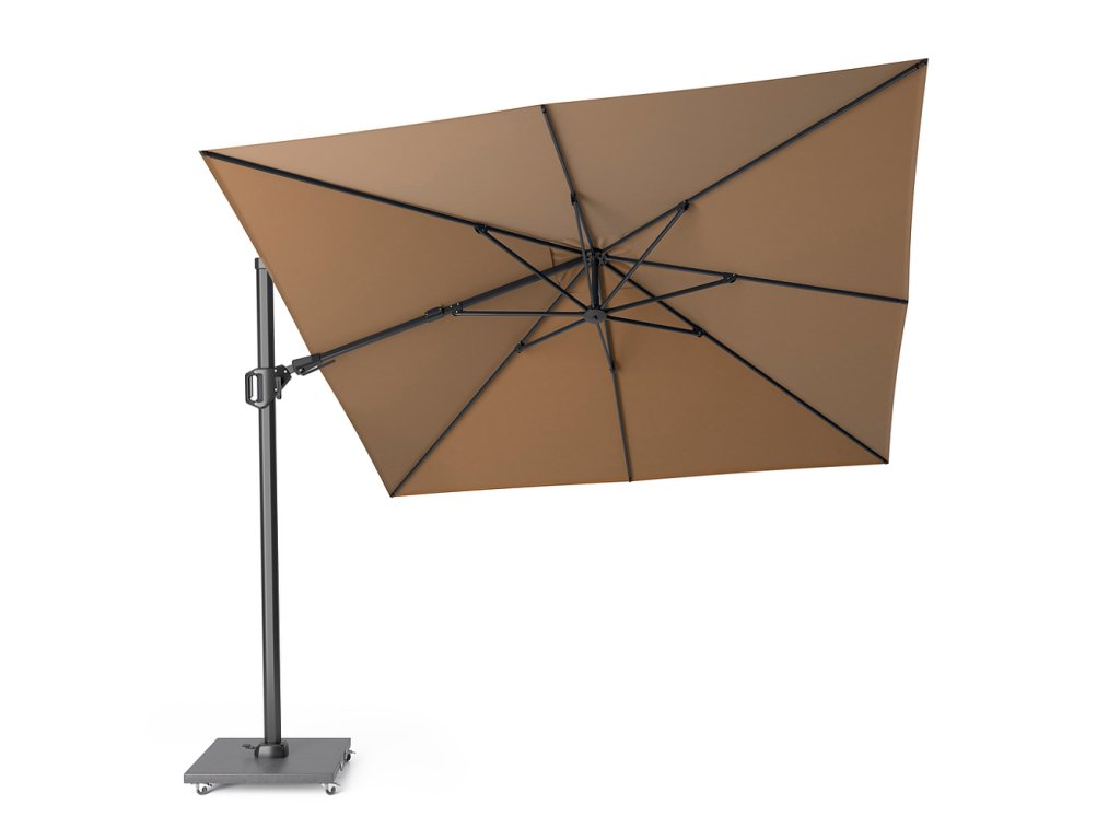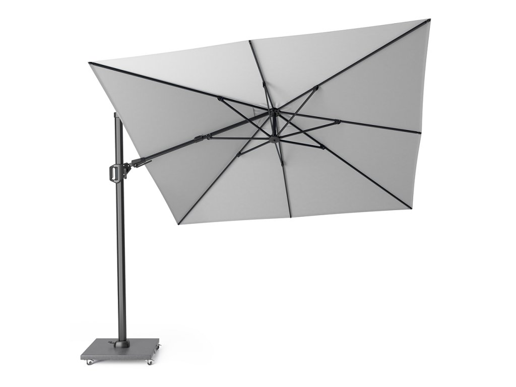 Standardní boční čtvercový slunečník Platinum Challenger T2 s mohutnou a propracovanou konstrukcí je otočný okolo své osy. Rotaci slunečníku docílíte sešlápnutím pedálu a poté manuálním pootočením. Nic složitého ani těžkého. Nízko položené paprsky při západu slunce zastíníte posouváním jezdce po jeho stojné boční noze. V případě, že Vám tyto funkce nestačí, můžete vrchlík naklápět ještě do stran.