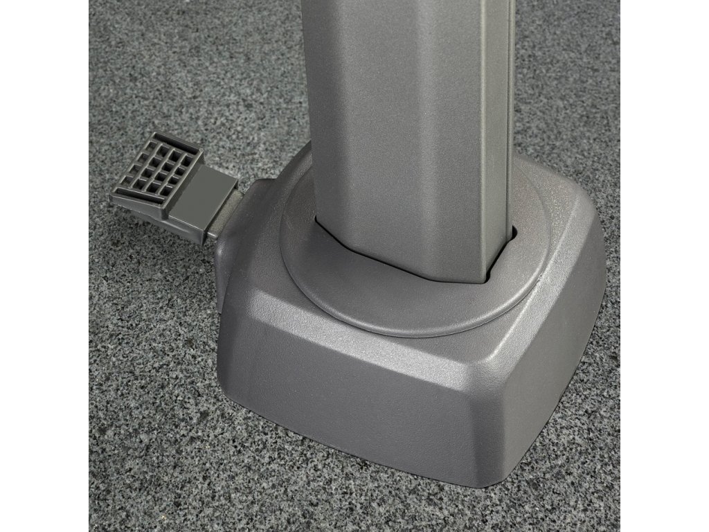 Ve spodní části slunečníku je otočný mechanismus opatřený 4-mi otvory pro ukotvení stojné nohy přímo do pevného podkladu (beton). Pro uchycení slunečníku v nezpevněném terénu máme v nabídce zabetonovávací modul. Pokud plánujete slunečníkem pohybovat, můžete zakoupit žulový pojízdný podstavec Modena 120/150 kg. Na pojízdný podstavec potřebujete rovnou zpevněnou plochu. U podstavce Modena 150 kg se dají v případě potřeby kolečka nahradit "nožičkami" a vznikne tak statický podstavec.