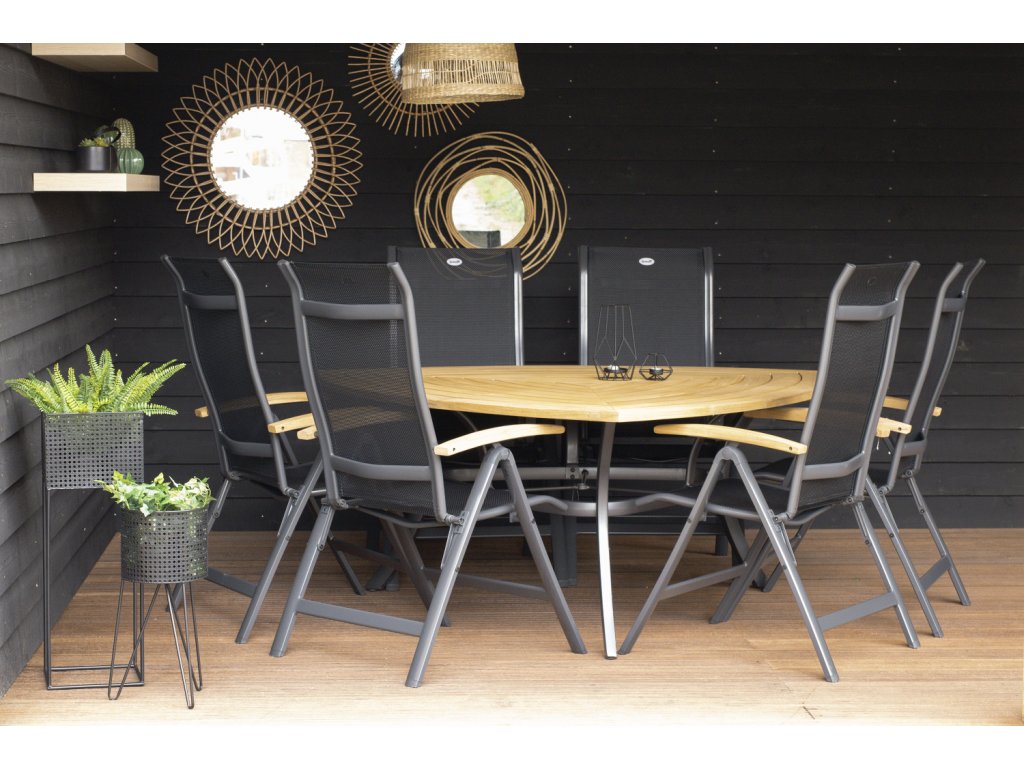 Stůl Triangular má hliníkovou konstrukci s teakovou deskou. Uprostřed stolové desky je otvor pro lampový slunečník, který nemusíte využívat. V tomto případě je u stolu k dispozici teaková krytka na zakrytí tohoto otvoru. Hliníková křesla Alice s teakovými područkami a černou pohodlnou textílií mají tvarovaný vysoký opěrák. Opěrák můžete napolohovat podle potřeby do předem nastavených pozic.